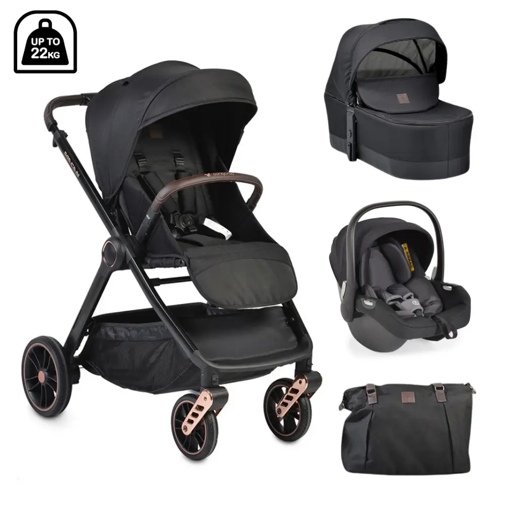 Set sadrži sportsko sedište sa 3 položaja naslona, iSize autosedište za bebe od rođenja do 83 cm dužine (oko 13kg težine) i čvrstu korpu za bebe do šest meseci. Tu je i teleskopska ručka od eko kože s 3 položaja, sigurnosni pojas u 5 tačaka obložen mekim štitnicima, podesivi oslonac za noge i zimse navlake za sva tri sedišta.