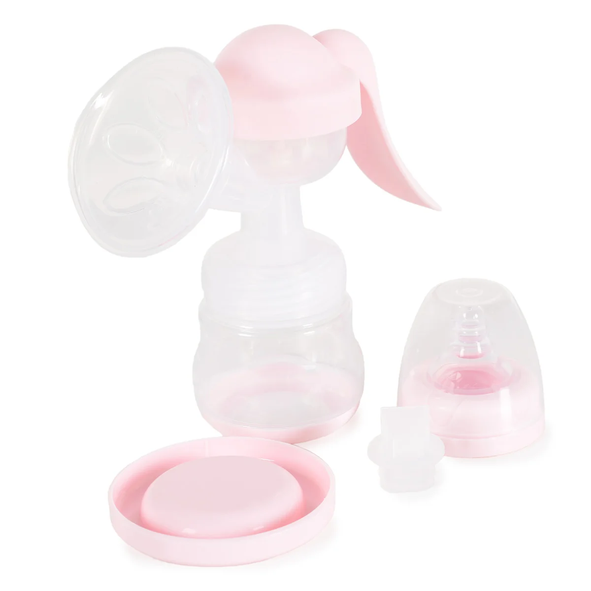Ručna pumpica za izmlazanje Cara roze boje sa ergonomskom drškom, silikonskim masažnim nastavkom i flašicom za majčino mleko, bez BPARučna pumpica za izmlazanje Cara – Roza