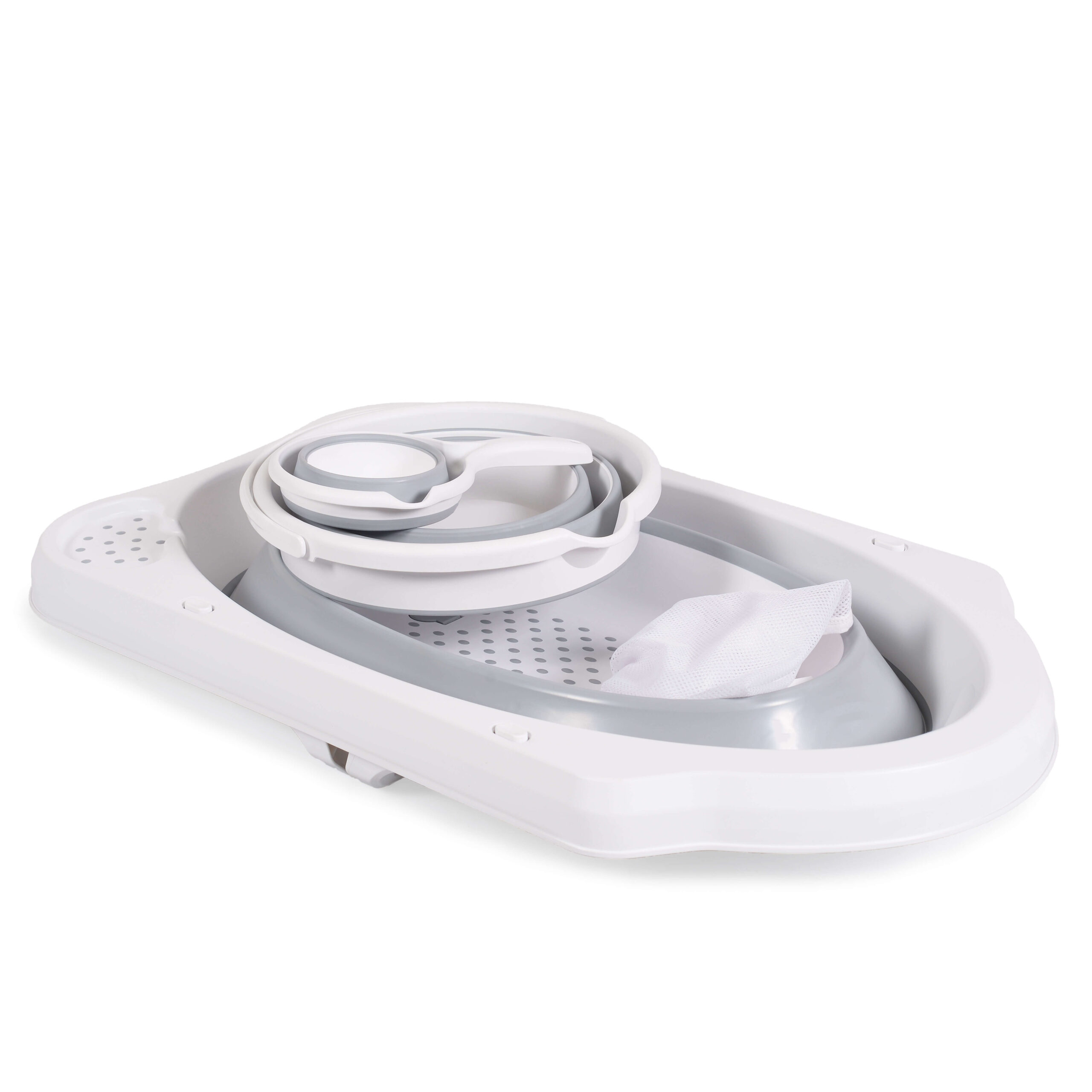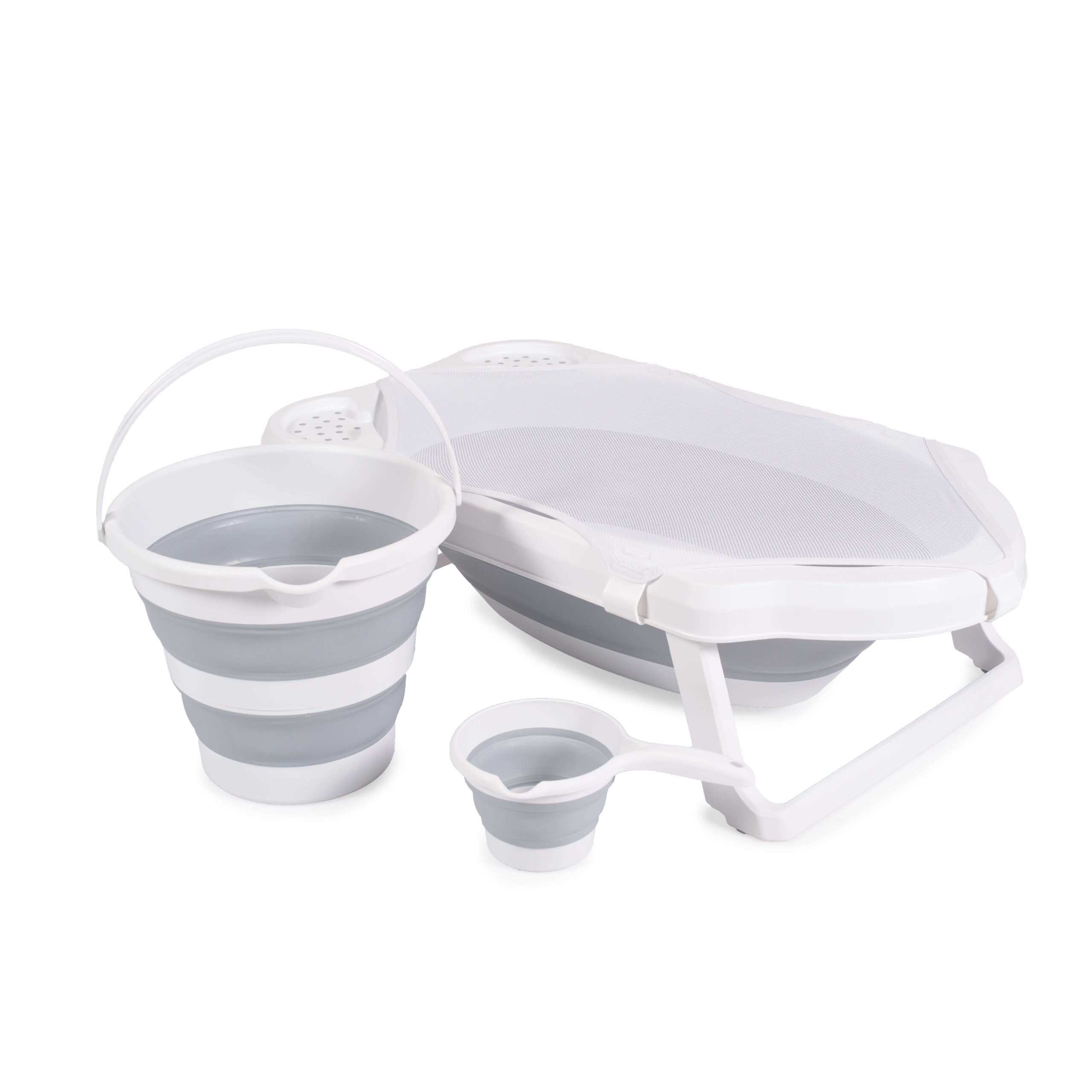 Set se sastoji od sklopive kadice, sklopive kofe, sklopive kantice za polivanje i mrežice za potporu bebe. Svi elementi su izrađeni od kvalitetnih materijala i dizajnirani tako da se lako sklapaju i odlažu kada se ne koriste.