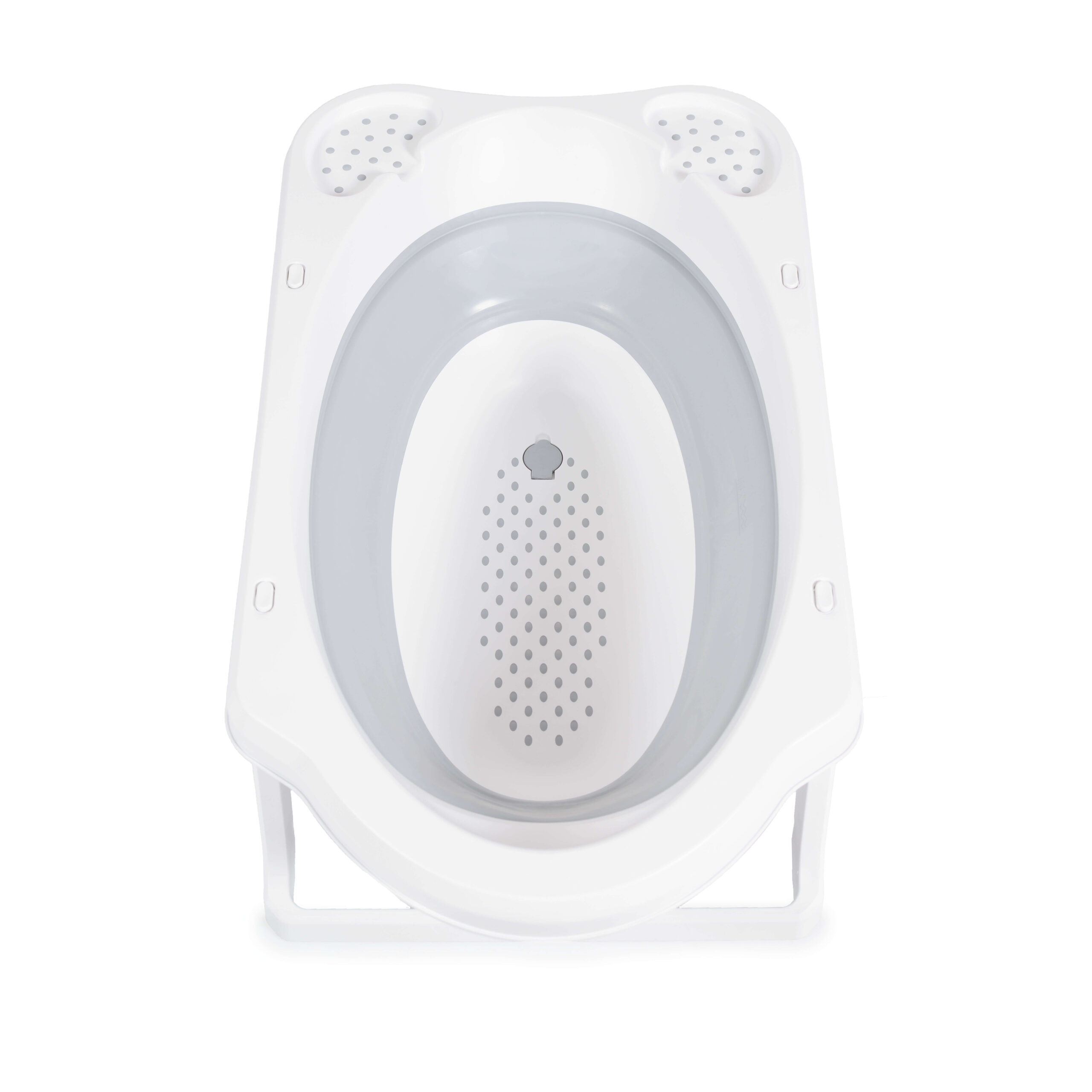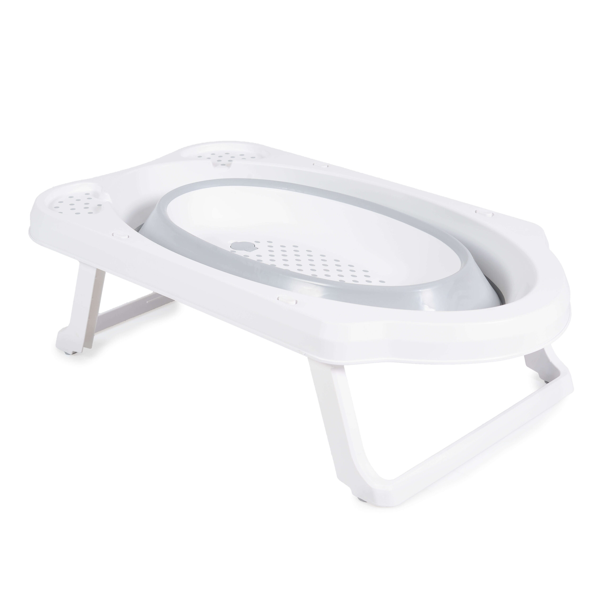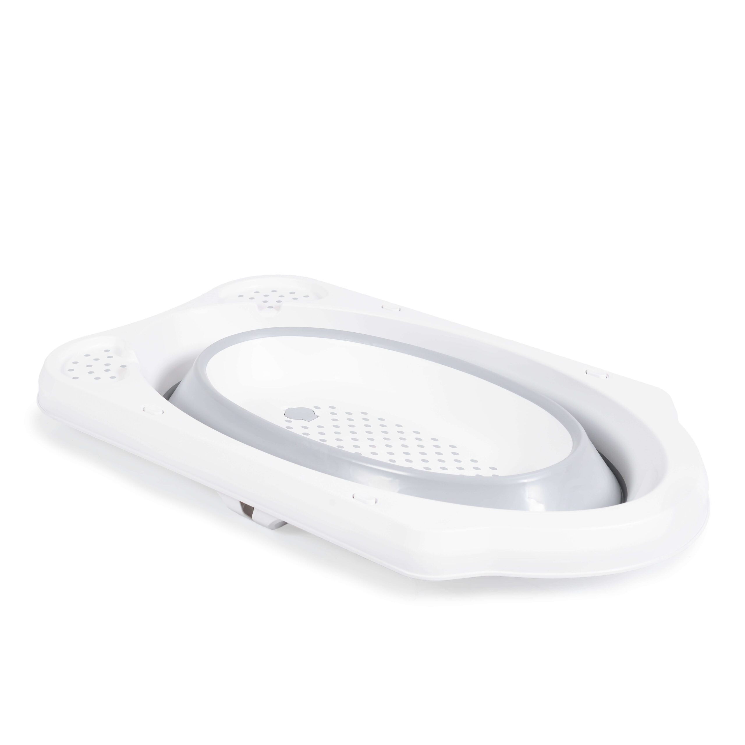 Sklopiva kadica ima protivkliznu podlogu na dnu i protivklizne čepove na nožicama, što obezbeđuje stabilnost tokom kupanja. Dva odeljka na kadici omogućavaju da sapun, šampon ili sunđer budu uvek pri ruci. Otvor za ispuštanje vode olakšava pražnjenje kadice bez podizanja i prosipanja.
