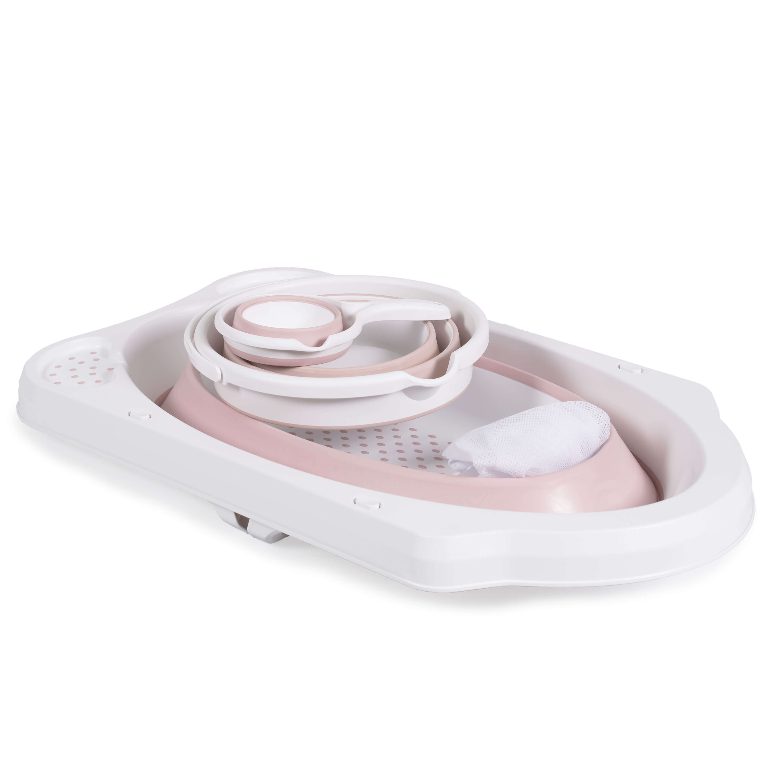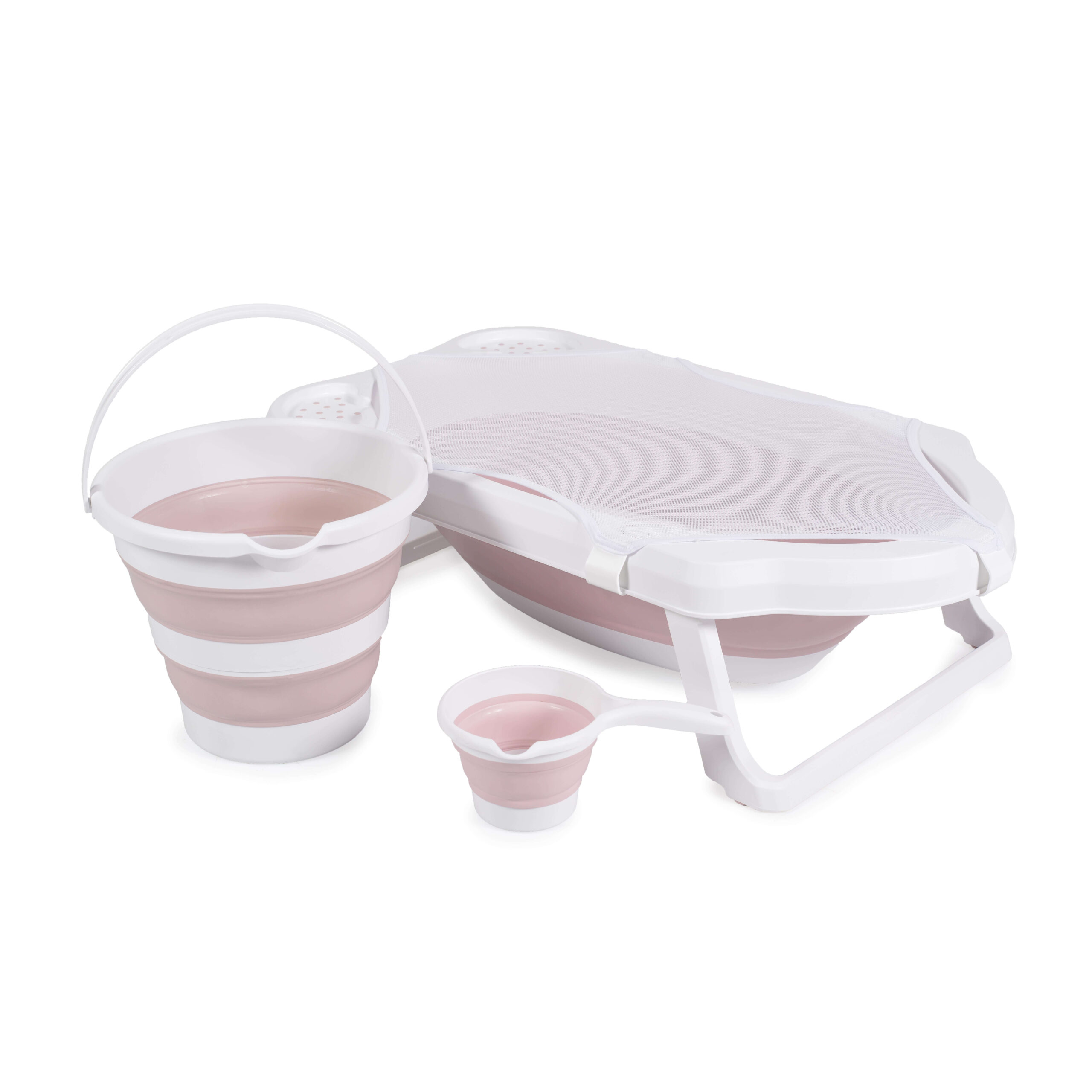 Set se sastoji od sklopive kadice, sklopive kofe, sklopive kantice za polivanje i mrežice za potporu bebe. Svi elementi su izrađeni od kvalitetnih materijala i dizajnirani tako da se lako sklapaju i odlažu kada se ne koriste.