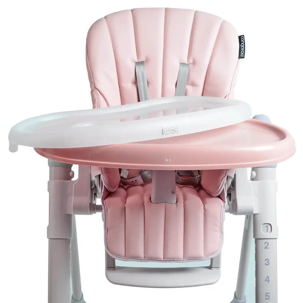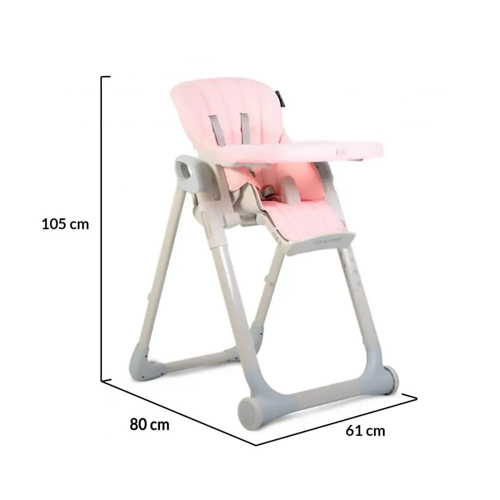 Stolica je opremljena sigurnosnim pojasom u pet tačaka, koji stabilno drži dete na mestu i sprečava neželjene pokrete tokom obroka. Prostrano sedište izrađeno je od mekane PU kože, prijatne na dodir i jednostavne za održavanje – dovoljno je jedno brisanje nakon jela.